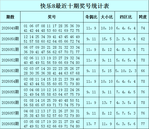 福彩应许8第2026058期开奖讲求:03 05 08 17 19 20 21 27 29 42 47 49 51 53 62 66 69 71 74 80,其中奖号奇偶比开出13:7,大小比开出11:9,包含7个小奇号码:03 05 17 19 21 27 29,2个小偶号码:08 20,6个大奇号码:47 49 51 53 69 71,5个大偶号码:42 62 66 74 80。