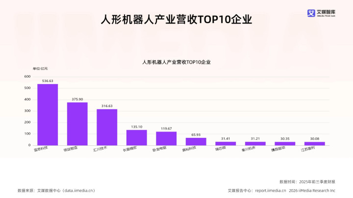 监测数据娇傲,东说念主形机器东说念主产业营收前三名企业轮番为:蓝想科技(536.63亿元)、领益智造(375.90亿元)、汇川本领(316.63亿元)。艾媒筹商分析师觉得,东说念主形机器东说念主产业营收高度连合,前三名在TOP10企业中的占比超73%。头部企业业务多连合于消耗电子精密组件、自动化及脱手系统,其宏大营收限度响应了在产业链关节门径的强势阛阓面位。产业结构呈现较着梯队分化,头部企业凭借限度与玄虚业务才能构筑壁垒,中部企业则在细分畛域深耕,整躯壳局健康但里面竞争热烈。营收限度各别直不雅体现了企业从玄虚巨头到细分畛域民众的发展阶段散播。