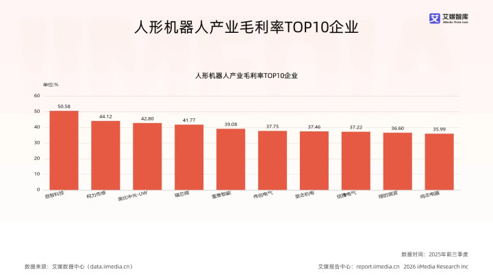 监测数据娇傲,东说念主形机器东说念主产业毛利率前三名企业分别为鼎智科技(50.58%)、柯力传感(44.12%)、奥比中光-UW(42.80%)。艾媒筹商分析师觉得,东说念主形机器东说念主头部企业凭借中枢零部件(如电机、传感器、芯片)的本领壁垒和惩办有谋划才能,获取了权贵高于产业平均水平的盈利才能。产业全体毛利率处于中等偏上水平,响应了本领密集型特征。高毛利率频频与本领护城河、家具定制化及客户粘性径直关连,是企业竞争上风的财务体现。