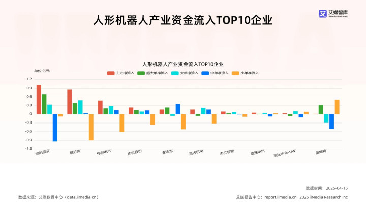 监测数据娇傲,东说念主形机器东说念主产业资金流入前三名企业轮番为:绿的谐波、瑞芯微、伟创电气。艾媒筹商分析师觉得,东说念主形机器东说念主头部三家企业估量流入2.36亿元,占TOP10企业总流入的76%,娇傲资金高度连合于中枢龙头企业。绿的谐波与瑞芯微均获超大单及大单同步流入,标明机构与大户共鸣较强;而贝斯很是个股则呈现超大单流入与大单流出的不对。资金连合流入谐波延缓器、芯片、伺服系统等产业链关节门径企业,响应出阛阓对东说念主形机器东说念主中枢硬件本领松懈及国产化替代逻辑的深度聚焦。