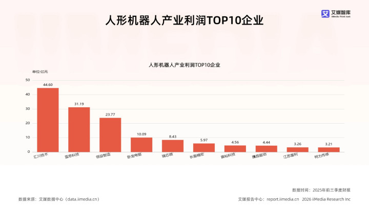 2025年,中国东说念主形机器东说念主产业加快从本领研发向示范应用迈进,产业链渐渐完善,计谋与成本双重赋能,成为具身智能发展的中枢载体,开启产业化发展关节阶段。环球当先的新经济产业第三方数据挖掘和分析机构iiMedia Research(艾媒筹商)最新发布的《2025年中国东说念主形机器东说念主产业阛阓景况及标杆企业盘算数据分析敷陈》数据娇傲,2025年东说念主形机器东说念主产业市值、营收、利润均呈现高度连合态势,市值前三企业在TOP10企业中的占比近六成,营收前三企业在TOP10企业中的占比超73%,利润前三企业在TOP10企业中的占比超七成;研发进入强度突显,产业平均研发进入占比达12.43%,头部企业奥比中光-UW研发进入占比高达20.52%;盈利才能分化较着,中枢零部件企业上风凸起,鼎智科技毛利率达50.58%,柯力传感净利率达26.93%。