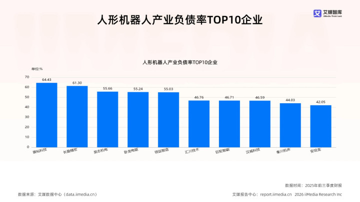 监测数据娇傲,东说念主形机器东说念主产业欠债率前三名企业轮番为:震裕科技(64.43%)、长盈精密(61.30%)、昊志机电(55.66%)。艾媒筹商分析师觉得,东说念主形机器东说念主高欠债企业多连合于精密制造与中枢部件畛域,这与其成本密集、捏续扩产及研发进入的产业本性相符。产业平均欠债率51.78%处于制造业常见水平,响应企业多数利用财务杠杆支捏业务彭胀。现时欠债水平需联接企业现款流与盈利匹配度评估风险,全体杠杆期骗尚属积极,但需柔软后续偿债才能与盈利增长的捏续性。