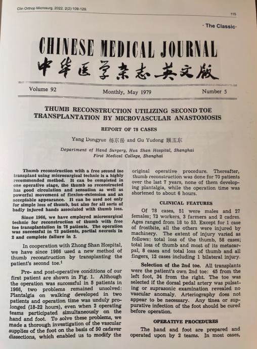 这台手术的主刀是华山病院手外科的首创东说念主杨东岳西宾,助手是其后的中国工程院院士顾玉东西宾。整个这个词手术中,其后的中国工程院院士、中山病院汤钊猷西宾也参与血管游离、吻合,历时近23小时,世界首例游离足趾移植再造拇指手术取得顺利。