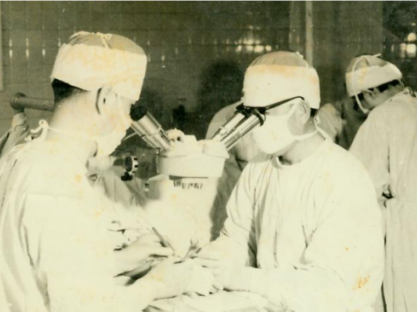 杨东岳医师(右二)与顾玉东医师(左一)在手术中