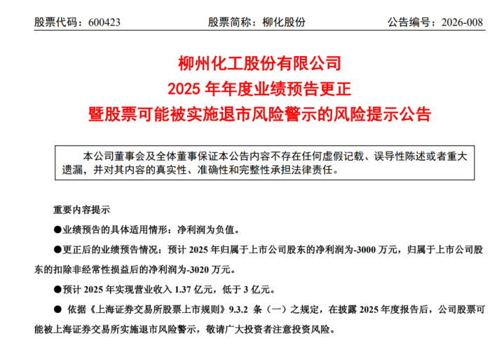 4月10日晚间,柳化股份(证券代码:600423)突发公告,大幅下修2025年齿迹预报,归母净利润由此前预盈628万元转为预亏3000万元。