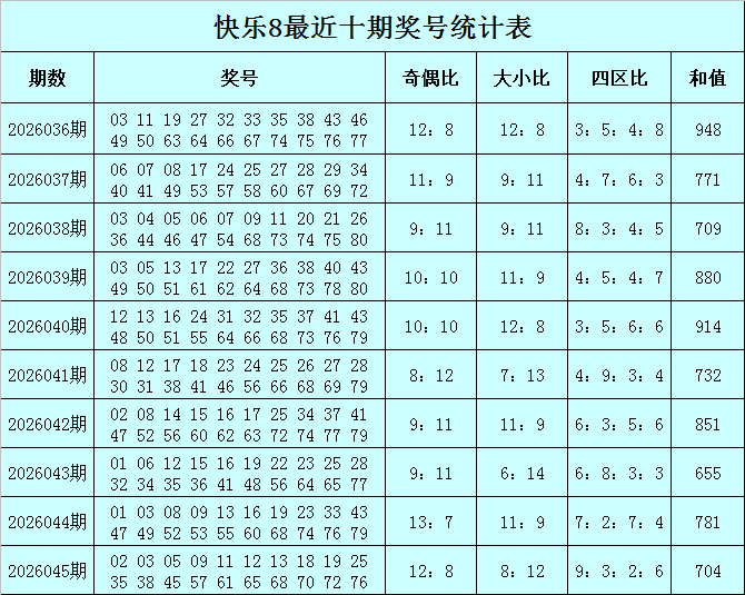 福彩情景8第2026045期开奖追想:02 03 05 09 11 12 13 18 19 25 35 38 45 57 61 65 68 70 72 76,其中奖号四区比为9:3:2:6,奇偶比为12:8,大小比为8:12,和值为704。