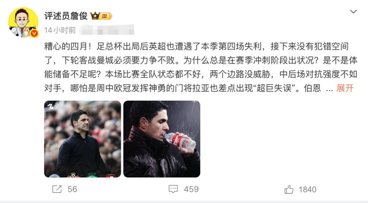 赛后,著名足球挑剔员詹俊指出为什么阿森纳老是在4月份掉链子。詹俊合计,阿森纳总在冲刺阶段掉链子主淌若体能储备不及,当今全队气象皆不好,两个边路莫得胁迫,中后场的强度也不如敌手。